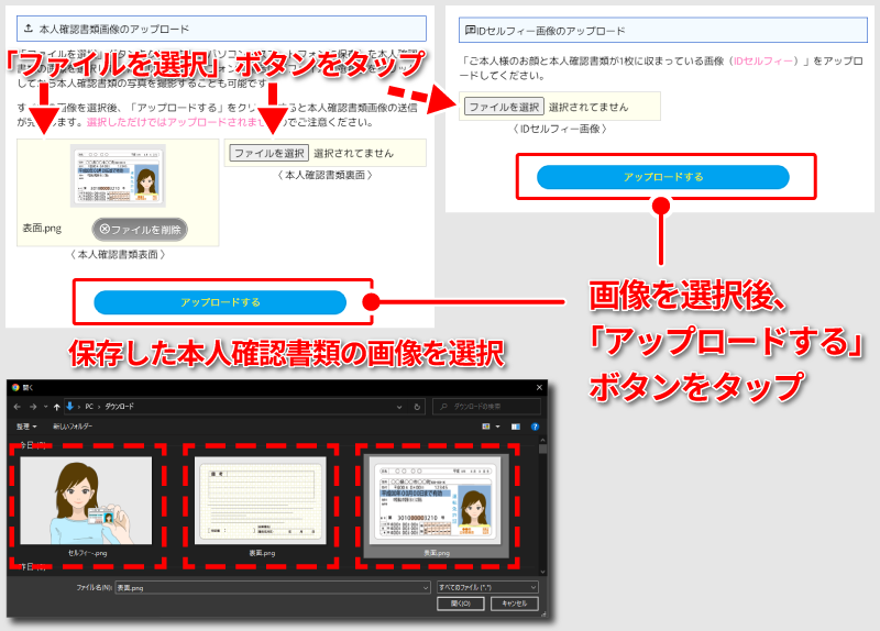 すべての画像を選択後、「アップロードする」ボタンをクリックし、本人確認書類画像をアップロードしてください。