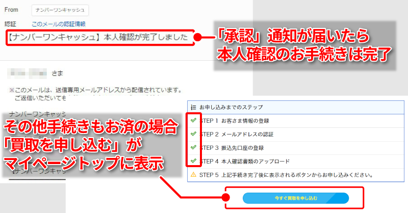 その他のお手続きもお済みの場合は、承認通知と同時に「買取を申し込む」というボタンがマイページトップに表示されます(ボタンが表示されない場合は、ページを更新してください)。