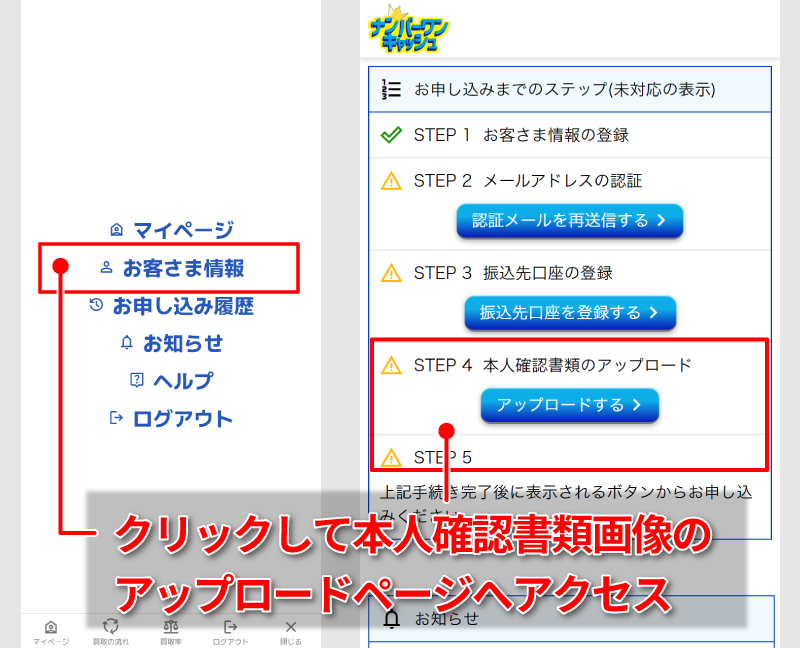 マイページトップの「お申し込みまでのステップ」または「お客さま情報」ページにあるリンクから、本人確認書類画像のアップロードページへアクセスしてください。